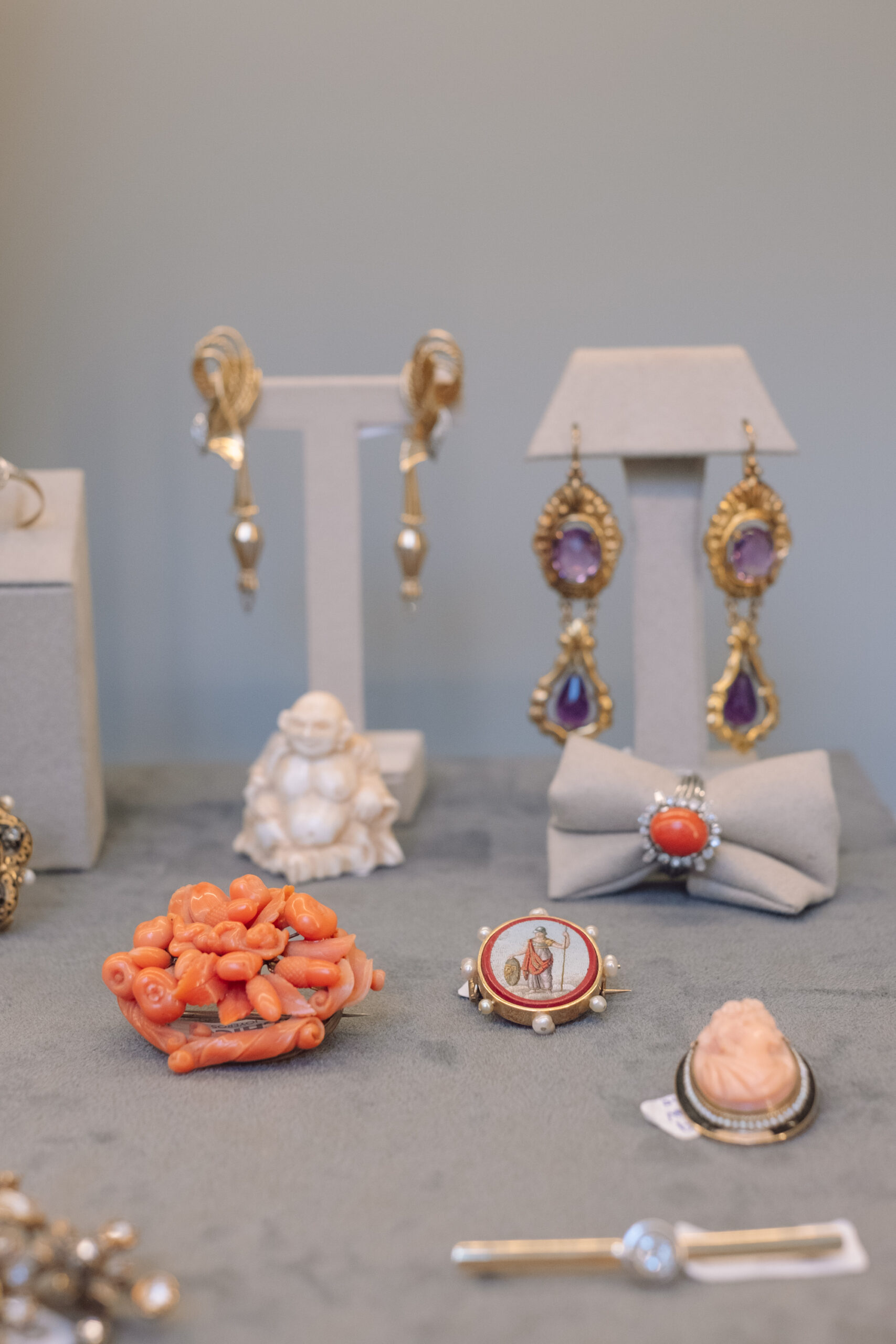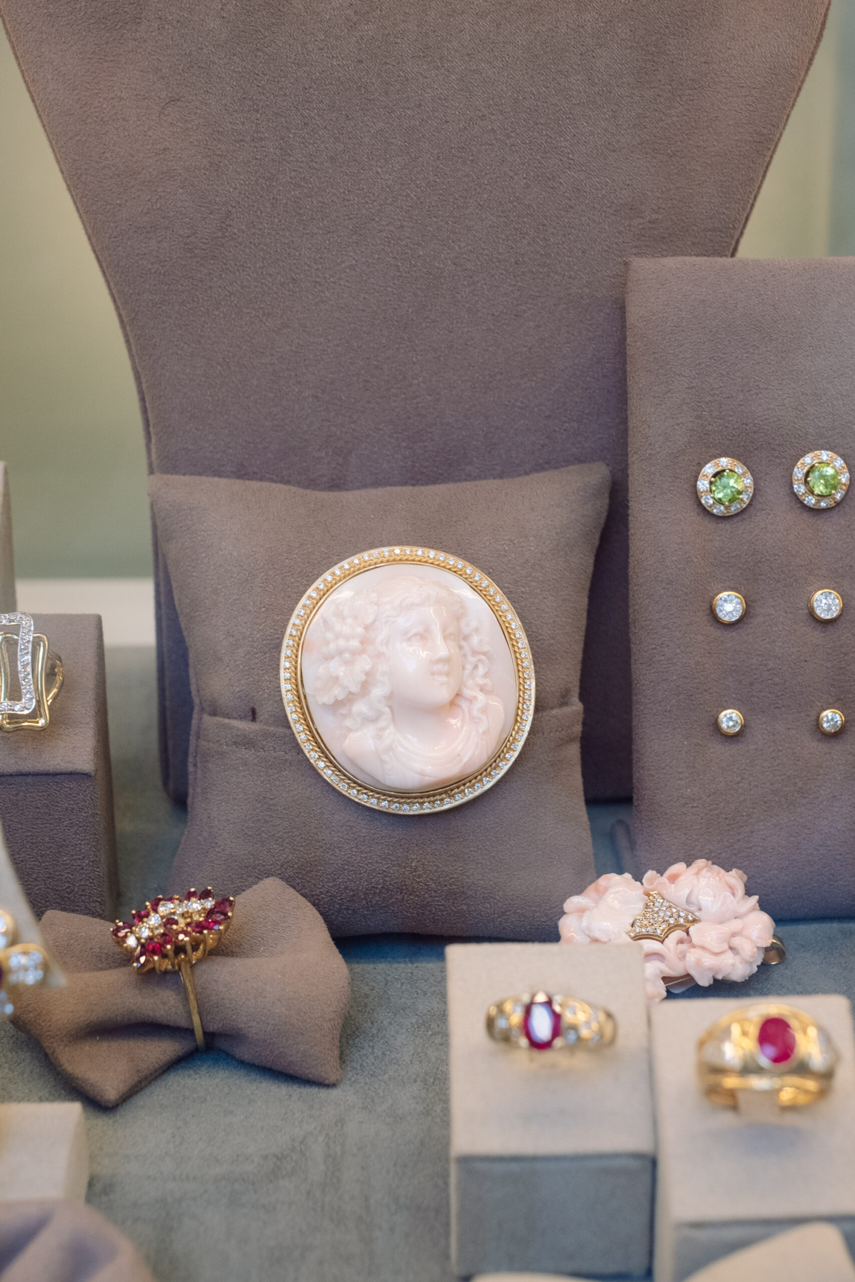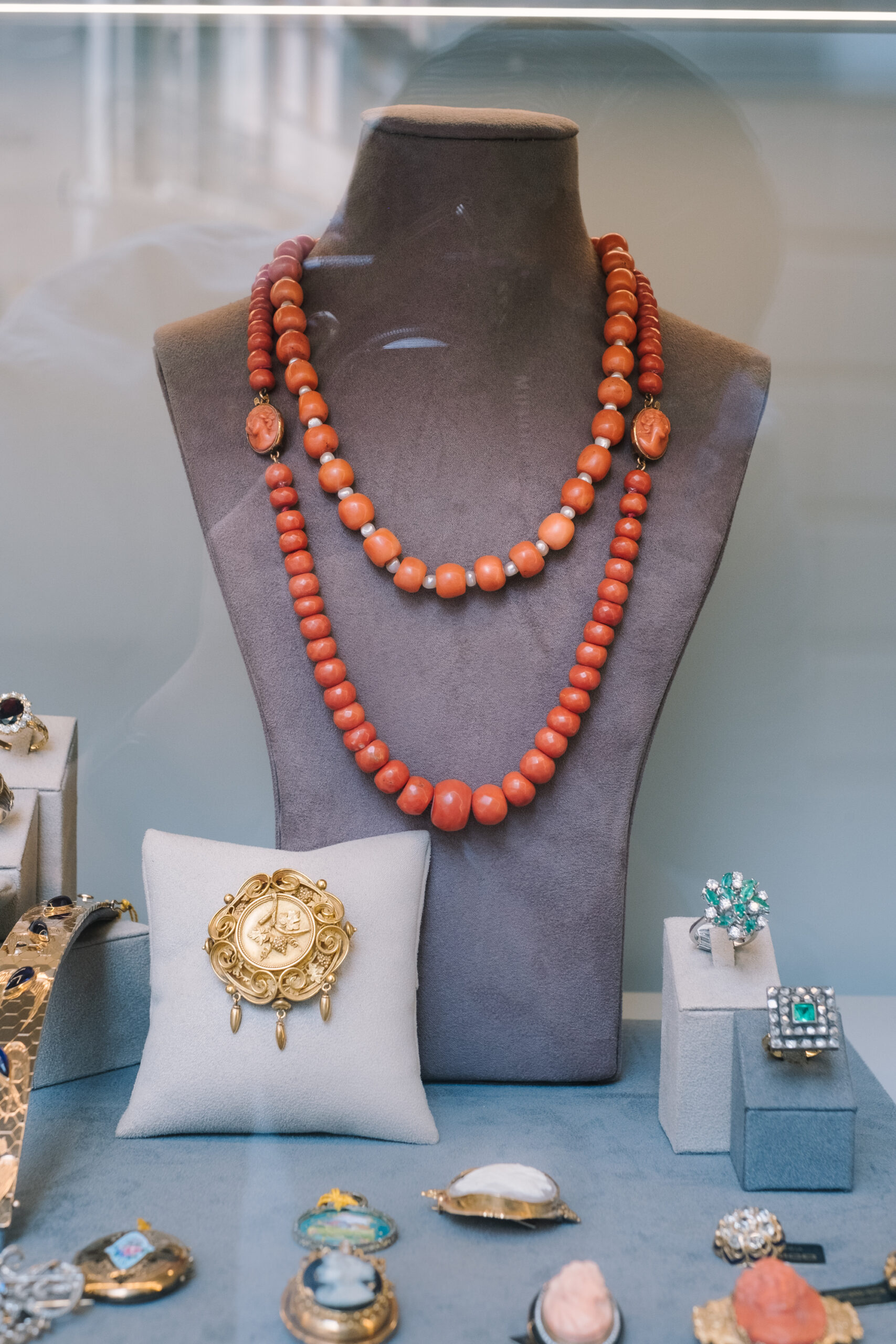 Camafeos tallados en coral, broches antiguos combinados con diamantes, gargantillas de cuentas entrelazadas con perlas… Son diseños que evocan otra época pero que siguen plenamente vigentes en la actualidad.