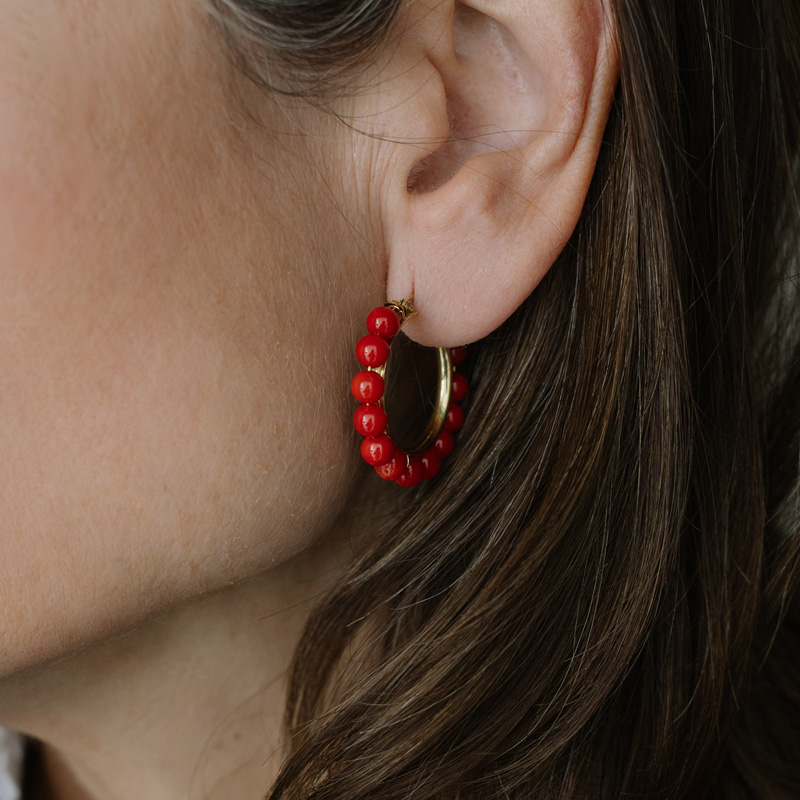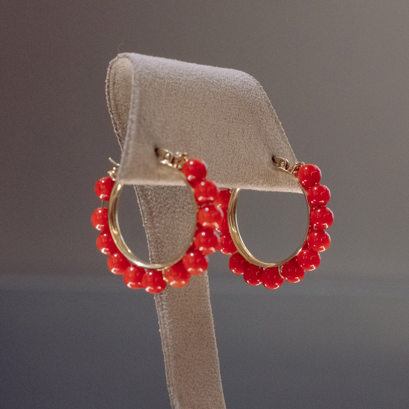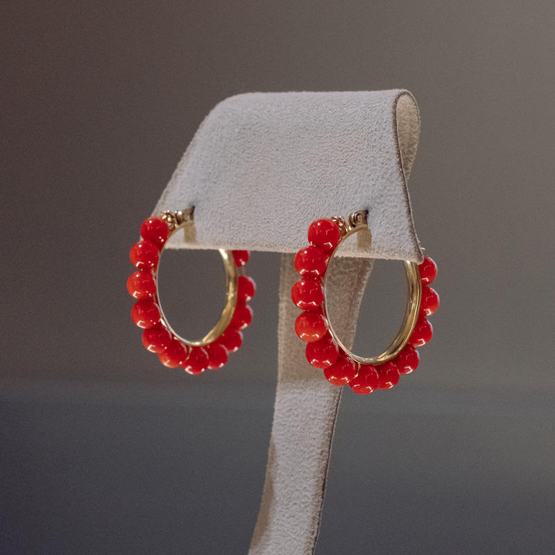 Argollas de oro amarillo 18 kilates y bolas de coral de 5 milímetros. Dimensiones 32 milímetros exterior.