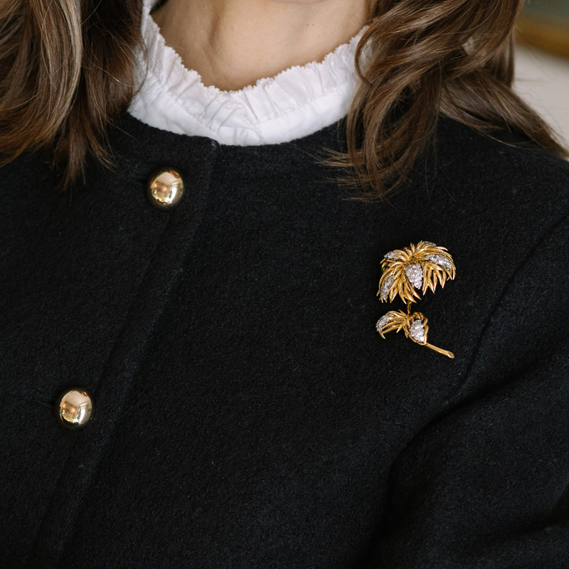 Broche Años cincuenta, de oro amarillo de 18k , en forma de flor. Peso total calculado de los diamantes en talla brillante 3.30ct. Longitud aproximada del broche 6.20cm , la flor tiene un diámetro aproximado de 3.20cm. Cierre de doble púa con seguro.