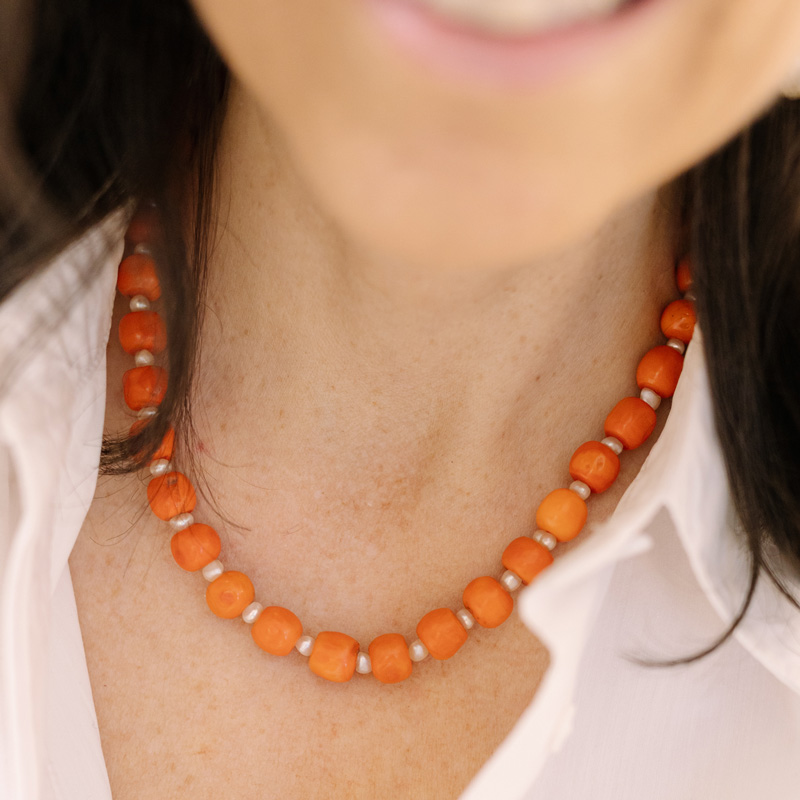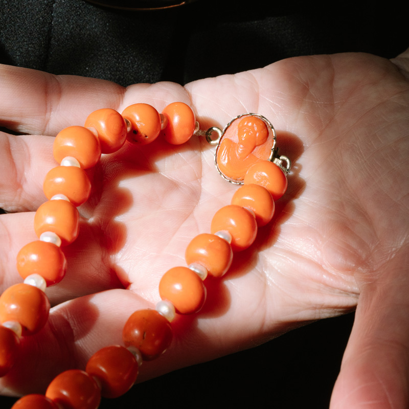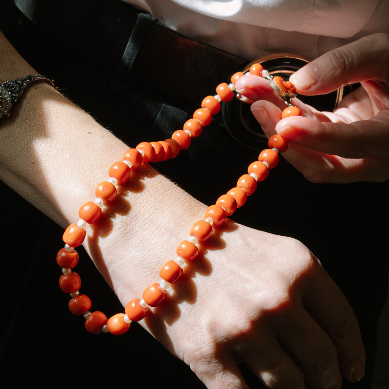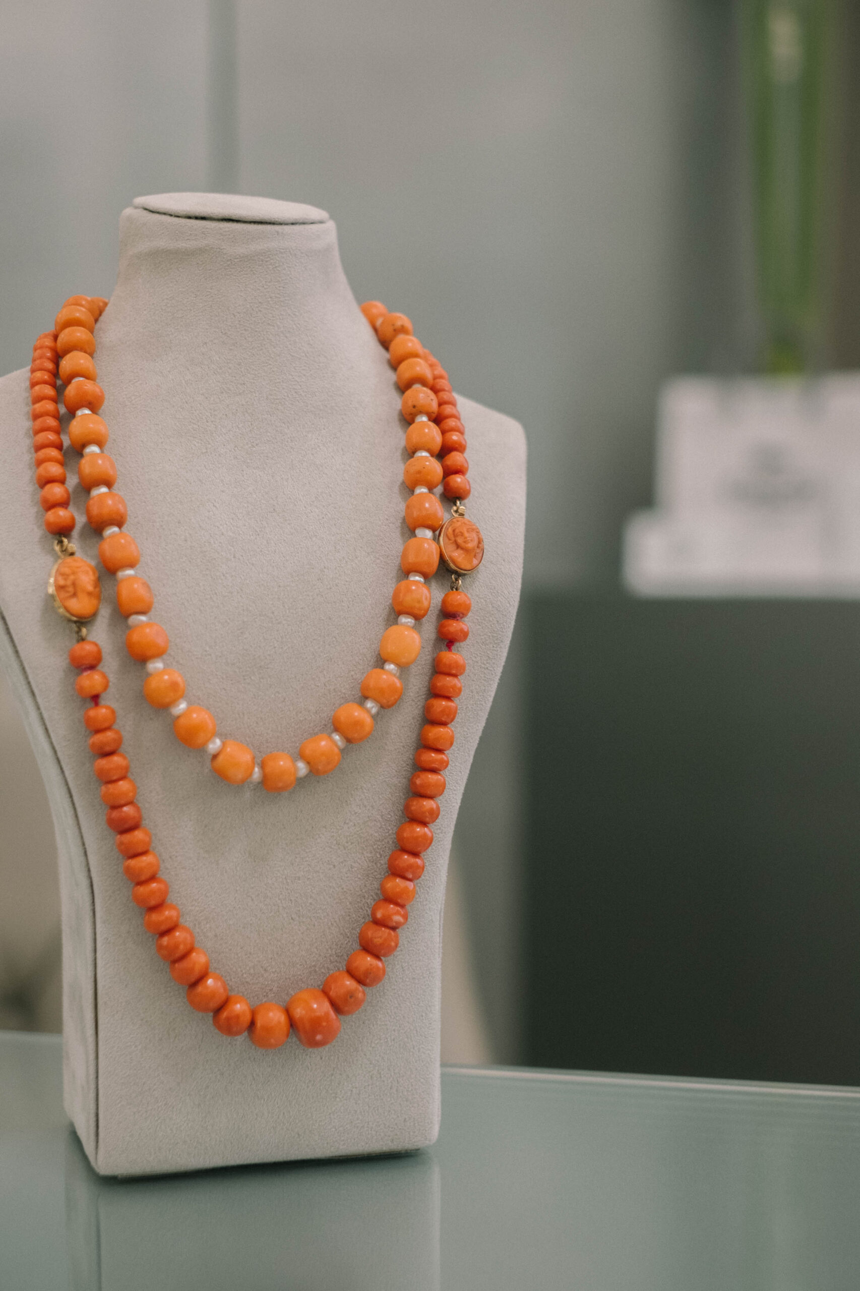 Collar de coral antiguo con perlitas intercaladas y broche con camafeo. Longitud 44 centímetros.