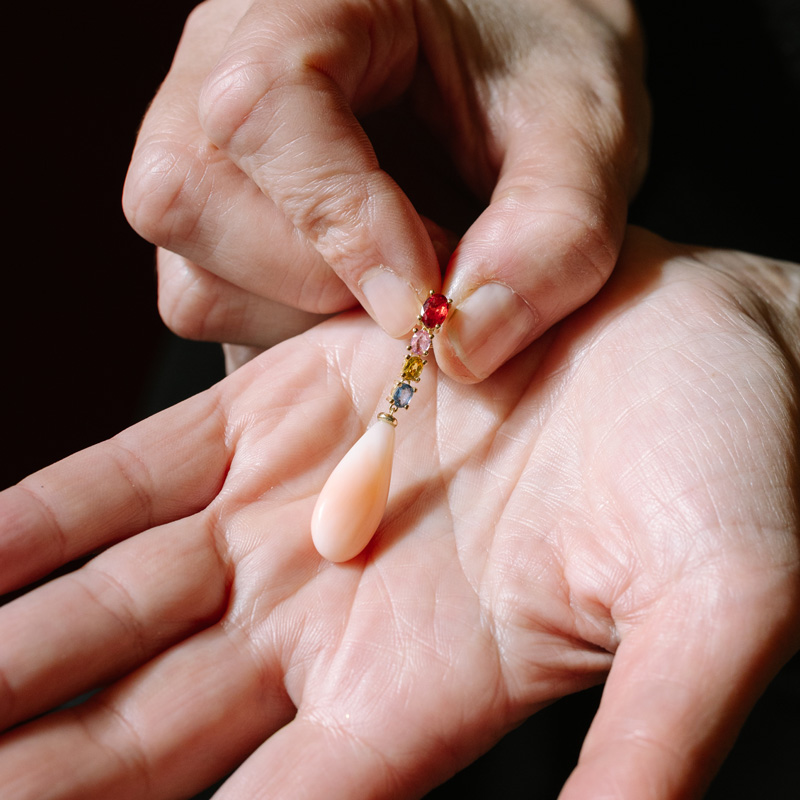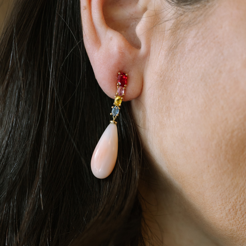 Pendientes de oro amarillo de 18k, montados con perillas de coral rosa ( 10 X 24mm) en la parte inferior y riviere de zafiros fantasía en la parte superior. Longitud total 4.50cm . Cierre de presión.