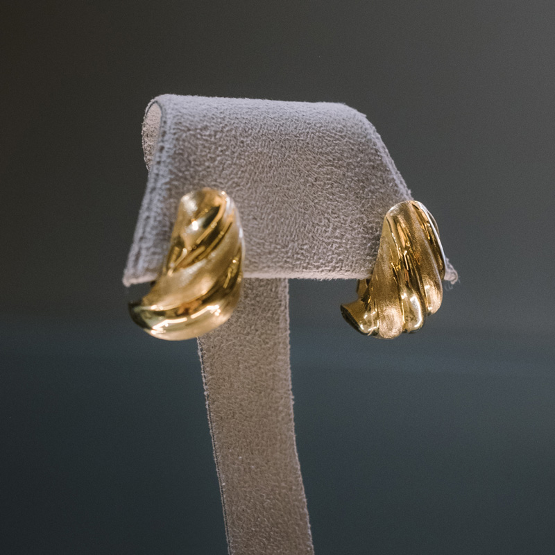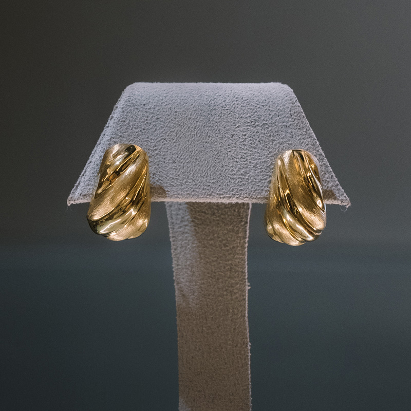 Pendientes tipo media argolla, gallonados de oro amarillo de 18k. Cierre omega.