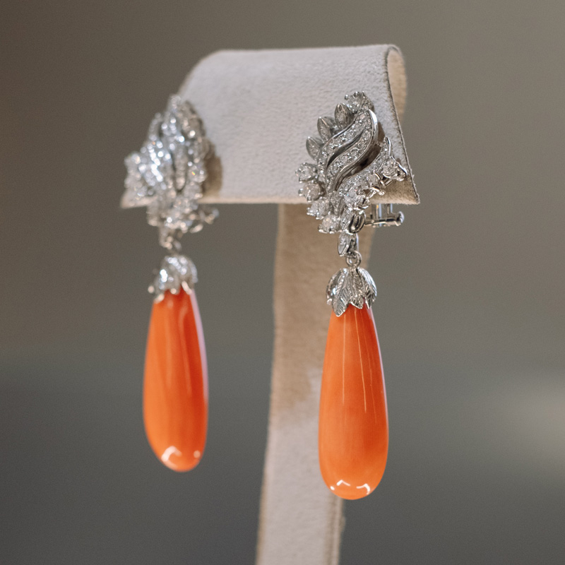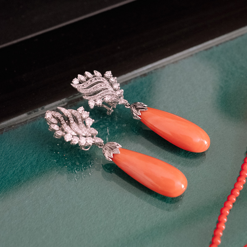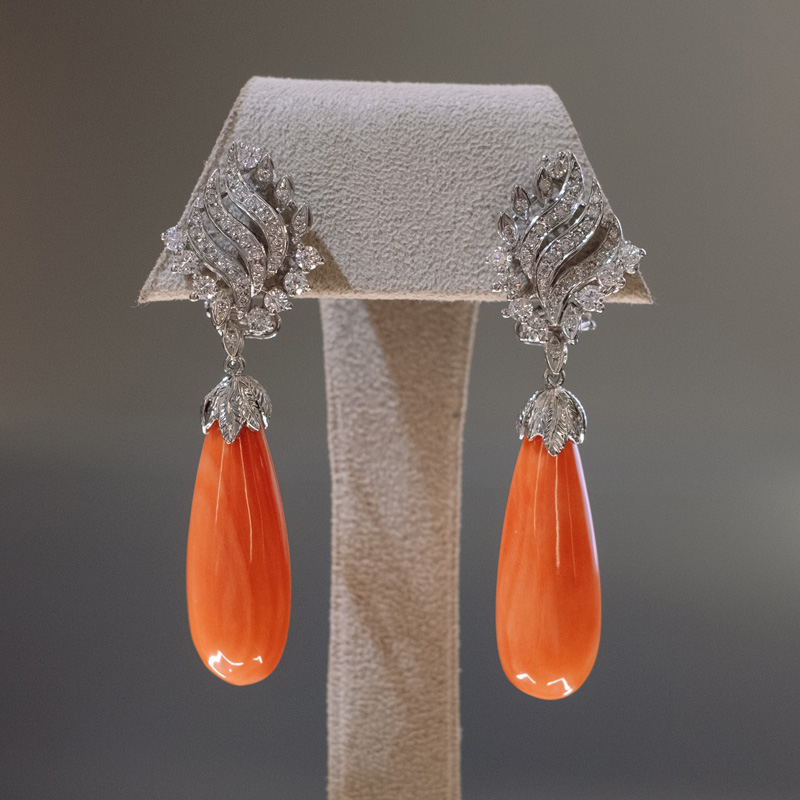 Pendientes de oro blanco de 18k, montados con unas impresionantes perillas de coral. En la parte superior tenemos una pieza a modo de hoja con diamantes engastados en talla brillante. El peso total estimado de los diamantes es de 1.86ct. Las perillas de coral se pueden quitar y poner.Longitud total 6cm. Cierre omega.