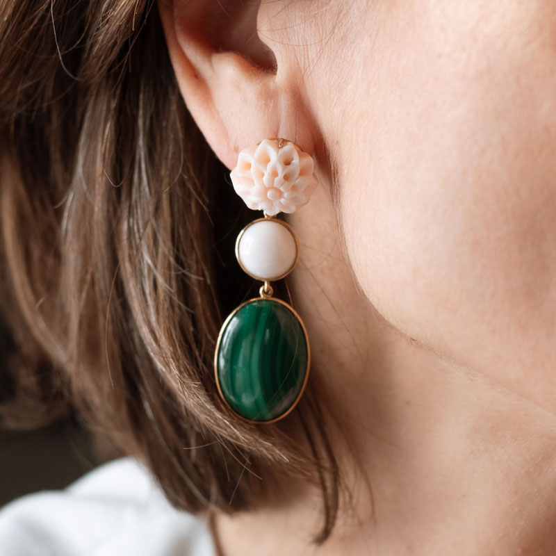 Pendientes de oro con coral rosa y malaquita
