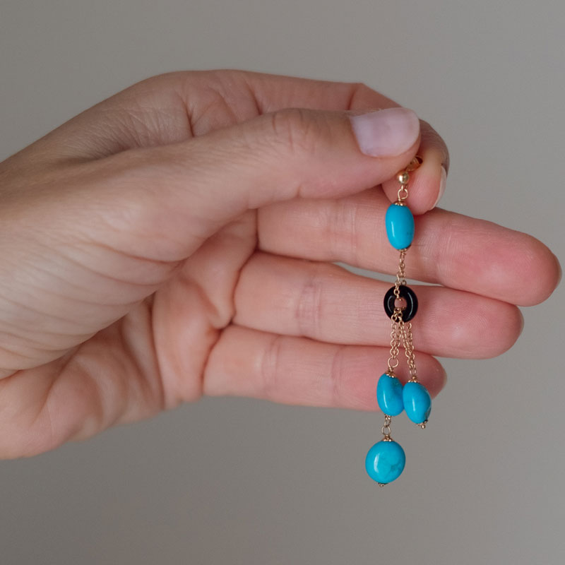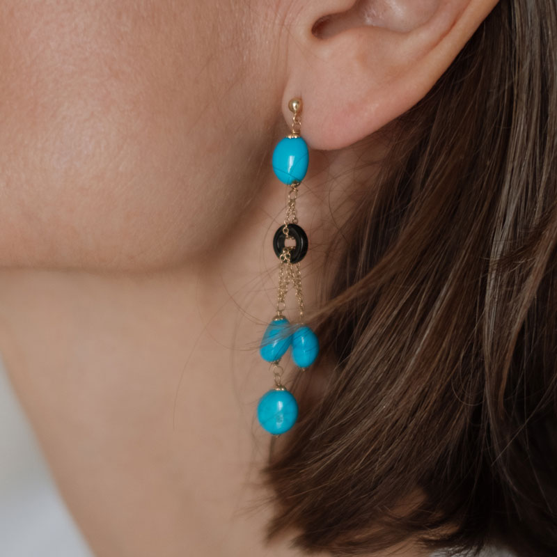 Pendientes de oro amarillo de 18k, montados con cuentas de turquesas y piezas circulares de ónix. Longitud 6.7cm. Cierre de presión.