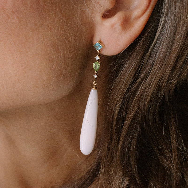 Pendientes de oro amarillo de 18k, montados con perillas de coral. En la parte superior de la pieza, encontramos una sucesión de engastes de diamantes, peridotos y topacios. cierre de presión. Longitud