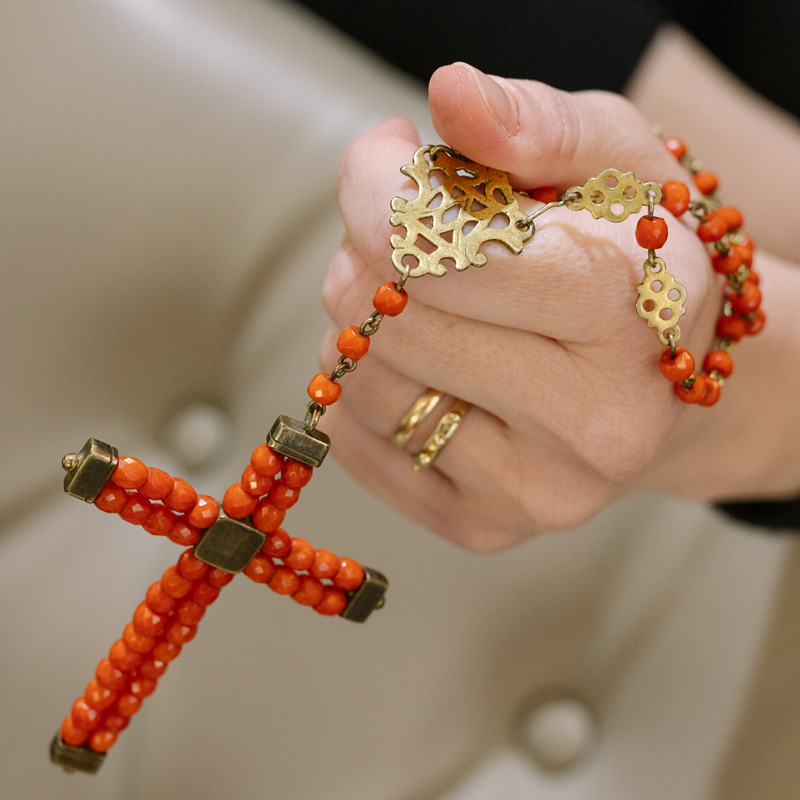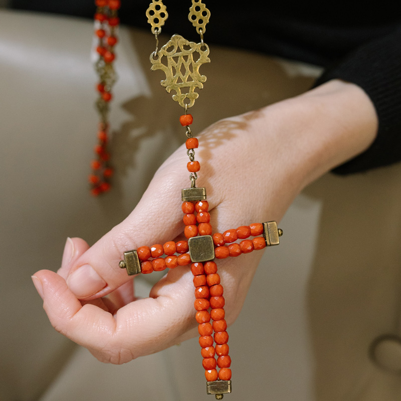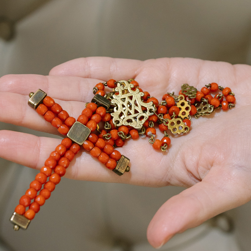 Rosario de plata dorada y cuentas de coral de 5mm. Época S. XIX.