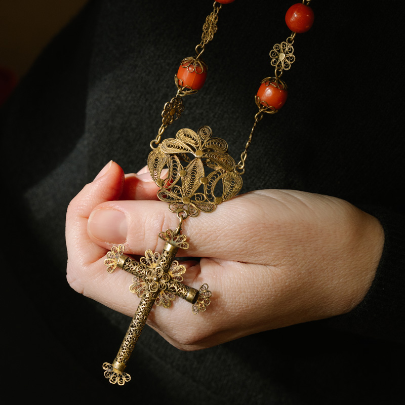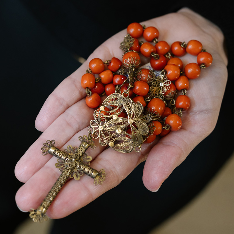 Rosario, S. XIX , de coral y plata dorada con trabajo de filigrana.